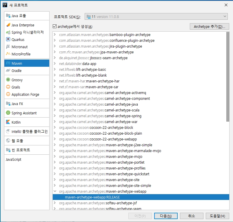 그 후 archetype에서 생성 이란 체크박스를 누른후 아래서 webapp를 누른다
